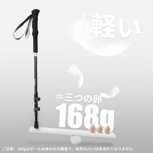 従来のアルミ製や重い素材のポールに比べて、1本168gという極めて軽量な設計が特徴で、長時間の登山やトレッキングでも疲労軽減に寄与します。