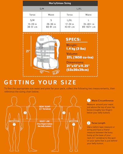 このバックパックは容量27リットル、寸法21インチ x 12インチ x 11.25インチで、2日間の行動に適したサイズですが、荷物が多い登山や長期のミッションにはやや小さいと感じることがあります。