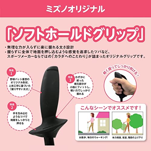 MIZUNOのモデルは人間工学に基づいたグリップ形状で、手首への負担を軽減し、長時間の歩行でも疲れにくい設計です。