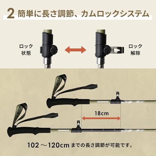 DABADAダバダの3段折りたたみ式トレッキングポールは、102~120cmまで長さを自在に調節でき、登山や街中のウォーキングなど多様なシーンで活躍します。