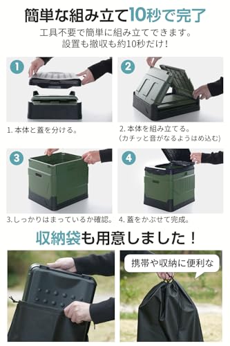 トイレ本体は耐荷重150kgの強化PP樹脂製で、-20℃から60℃の環境下でも変形しにくいため、車のトランクや押し入れなど、限られたスペースにも安心して保管できます。