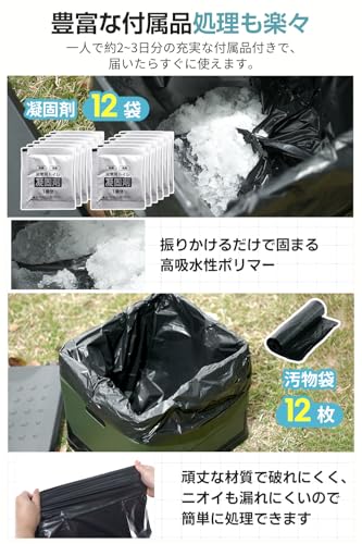 この携帯トイレは凝固剤、消臭剤、防臭袋を組み合わせた5役対応で、衛生面と臭気対策を徹底しています。