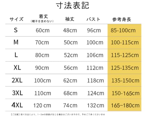 本製品はSから4XLまで幅広いサイズ展開があり、各サイズはおおよその適応身長で細かく区分されています。