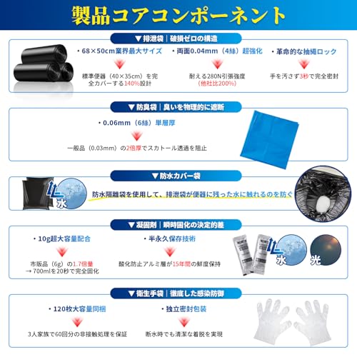 - 凝固剤性能:速やかに排泄物を固化し、安全かつ衛生的に処理する機能