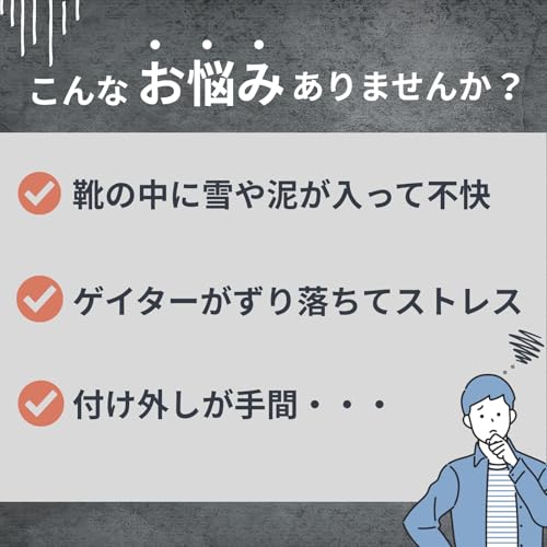 また、他の紐結びやボタン式のゲイターに比べ、初心者でも扱いやすく操作ミスが少ないため、ストレスなく利用できます。