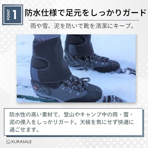 KURASALEゲイターは高い防水性能を持ち、アウトドアでの悪天候下でも足を濡らすリスクを低減します。