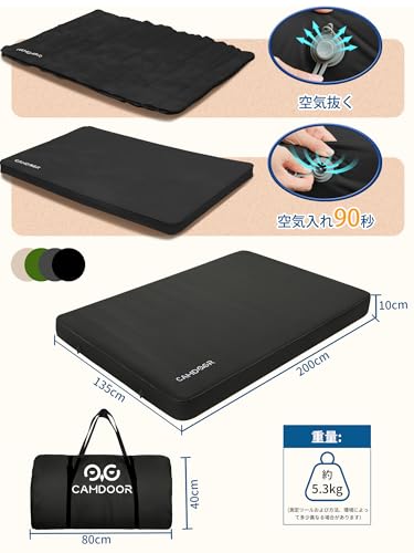 特に「CAMDOOR キャンプ マット エアーマット ダブル 厚手 10cm」は、90秒自動膨張機能や幅広の200×135cmサイズ、そして10cmの厚みという特徴があり、寝心地の良さを追求する方に適しています。