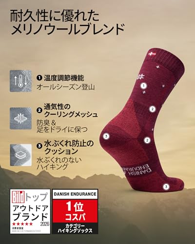 [DANISH ENDURANCE] ハイキングソックスは、特に登山やハイキングに適した高機能なメリノウール混素材を用いた靴下です。