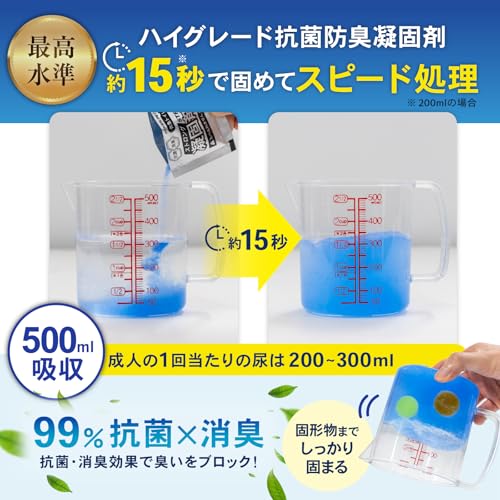 この商品に含まれる凝固剤は、水や汚物と混ざることで瞬時に固まり、悪臭や菌の繁殖を抑制します。