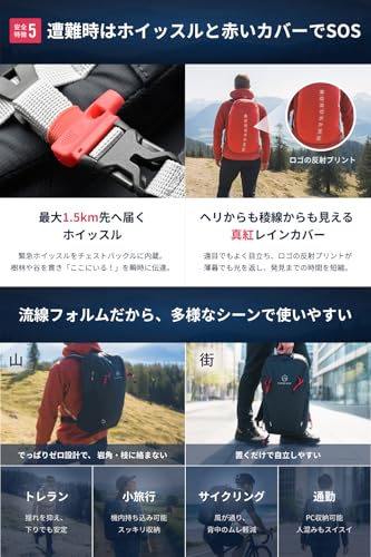 - 安全基準の徹底:このリュックは、山岳救助隊のプロからのフィードバックを基に設計されており、日帰り登山でも安心して使える安全機能が充実しています。
