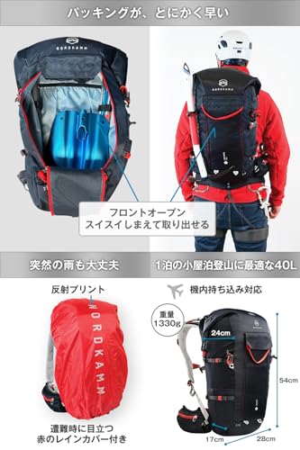40Lの容量は日帰りから一泊の登山に必要な装備を十分に収納でき、レインカバーやヘルメットホルダーも備わっています。