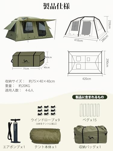 特にファミリーやグループキャンプに適しており、組み立てに金属ポールを使わずエアーフレーム構造を採用しているため、女性や初心者でも短時間で設営が可能です。