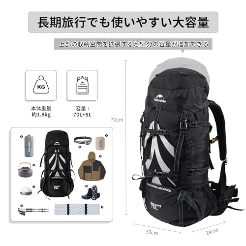 Naturehikeの70L+5Lバックパックは、背面長調整機能により体格に合った快適な背負い心地を実現し、肩や腰への負担軽減に貢献します。