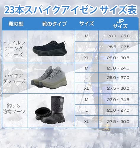 特に登山靴や厚底トレッキングシューズとの相性が良く、アイススパイクの滑り止め効果を最大限に発揮します。
