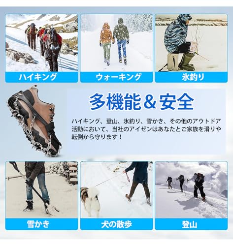 SEEYAの23本爪チェーンスパイクは、強化ステンレス製の耐摩耗スパイクが氷面や雪道に高いグリップ力を発揮し、滑落や転倒のリスク軽減に貢献します。