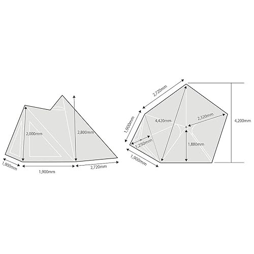 使用時のサイズは約442×420cm、高さ280cmで、ファミリーキャンプやデュオキャンプにも適した余裕のある空間を確保。